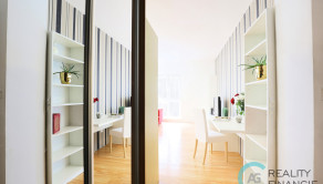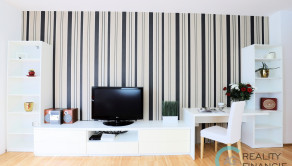 Z chodby so zabudovanou priestrannou Rolldor skriňou , ktorá zabezpečuje dostatočný odkladací priestor. Veľmi šikovne je tu zabudovaná aj práčka. Následne vstupujeme priamo do centra bytu - obývacej izby spojenej s kuchyňou, kde dominuje moderná a impozantná červená sedačka, ktorá dodáva miestnosti luxusný výzor. Po pravej strane je pracovný kútik - stôl so stoličkou , obývacia zostava a knižnica. Oproti sedačke je vstavaná kuchynská linka s kuchynským príslušenstvom . V spálni je veľká manželská posteľ s odkladacím priestorom a vstavaná Rolldor skriňa. Je komplet zariadený , stačí sa len nasťahovať.