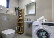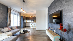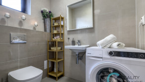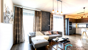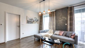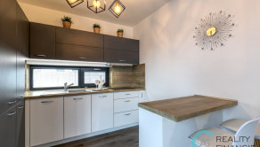 Po vstupe do bytu sa nachádzate v samostatnej vstupnej hale z ktorej máte vstup do kuchyni spojenej s obývačkou a schodisko, ktoré Vás zavedie na horné poschodie. Na prízemí sa nachádza už spomenutá obývačka s kuchyňou, špajza a wc. Z obývačky máte priamy vstup na priestrannú terasu o výmere 12m2 a záhradu.
