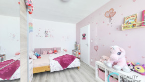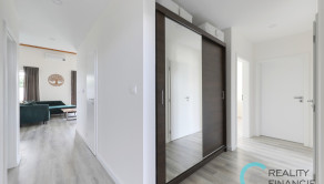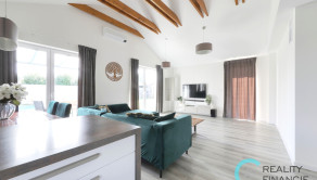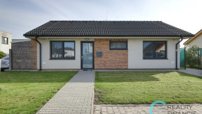 Predná stena rodinného domu je osadená atraktívnym tehličkovým dekorom, ktorý upúta snáď každého klienta. Vstupná priestranná chodba pokračuje veľmi zaujímavým a účelným členením domu , kde je naľavo vstup do samostatnej izby a napravo je krásna ,moderná a veľká kúpeľna s vaňou, sprchovacím kútom a veľkým umývadlom. Na konci chodby sú ďalšie dve samostatné izby. Jedna izba je na strane ulice a druhá izba má francúzske okno s východom na malú terasu už priamo do záhrady. Stredom dispozície sa dostaneme ďalej napravo do technickej miestnosti a na ľavo je samostatné WC s umývadlom. Potom sa pred nami otvorí veľkolepý priestor obývacej izby voľne prepojený s kuchyňou. Vzdušnosť a svetlo nám zabezpečí atypicky riešený vysoký strop v tvare klasickej strechy , kde su v strope upevnené drevené trámy, ktoré ešte upevnia pocit jedinečnosti z tohto priestoru.